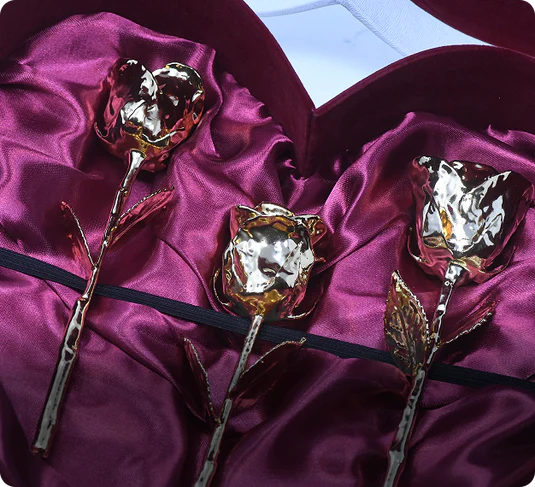 Browse dozens of roses and boxes in 24K gold, platinum, silver, and more.