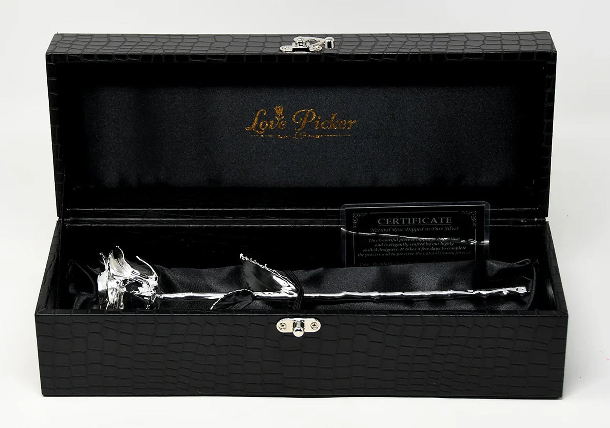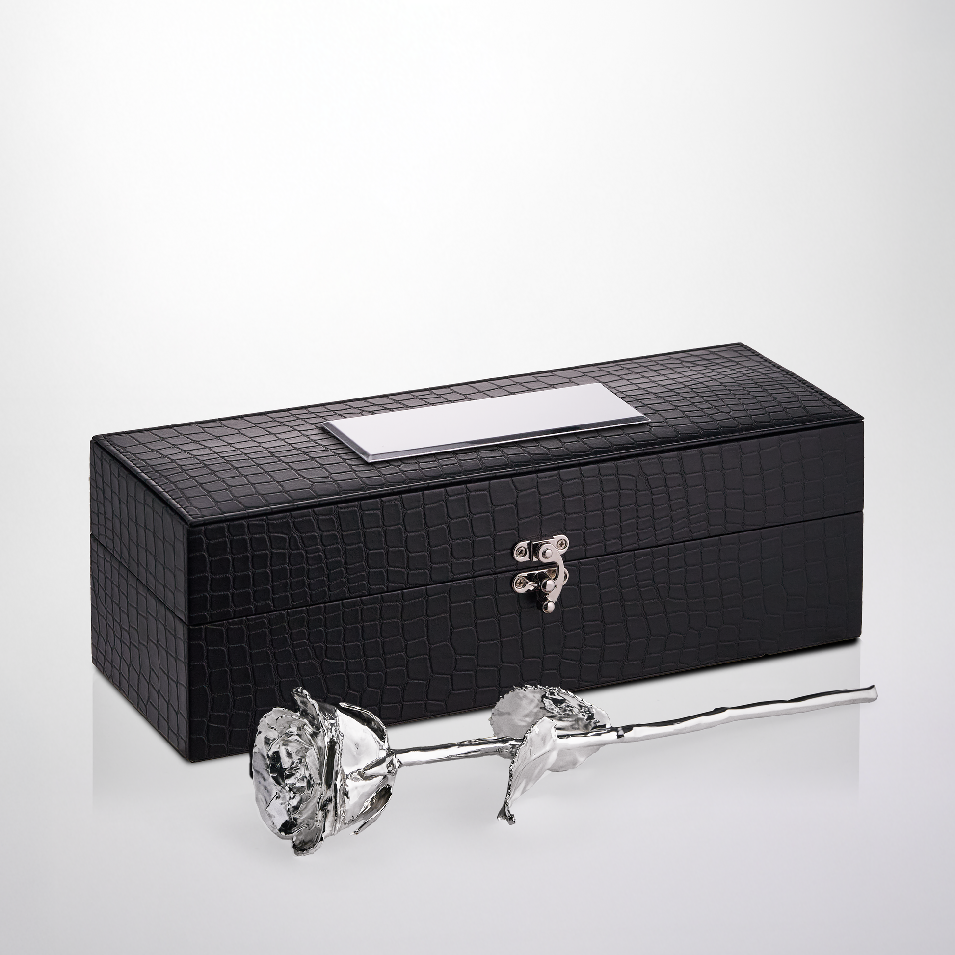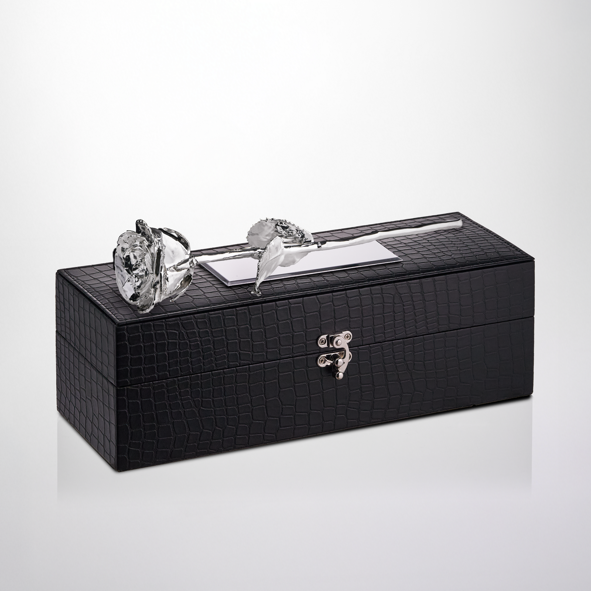 وردة مطلية بالفضة أو البلاتين مقاس 11.5 بوصة في صندوق جلدي فاخر منقوش حسب الطلب - وردة محفوظة حقيقية بلمسة نهائية معتمدة من الفضة، موضوعة في صندوق هدايا فاخر من جلد التمساح.