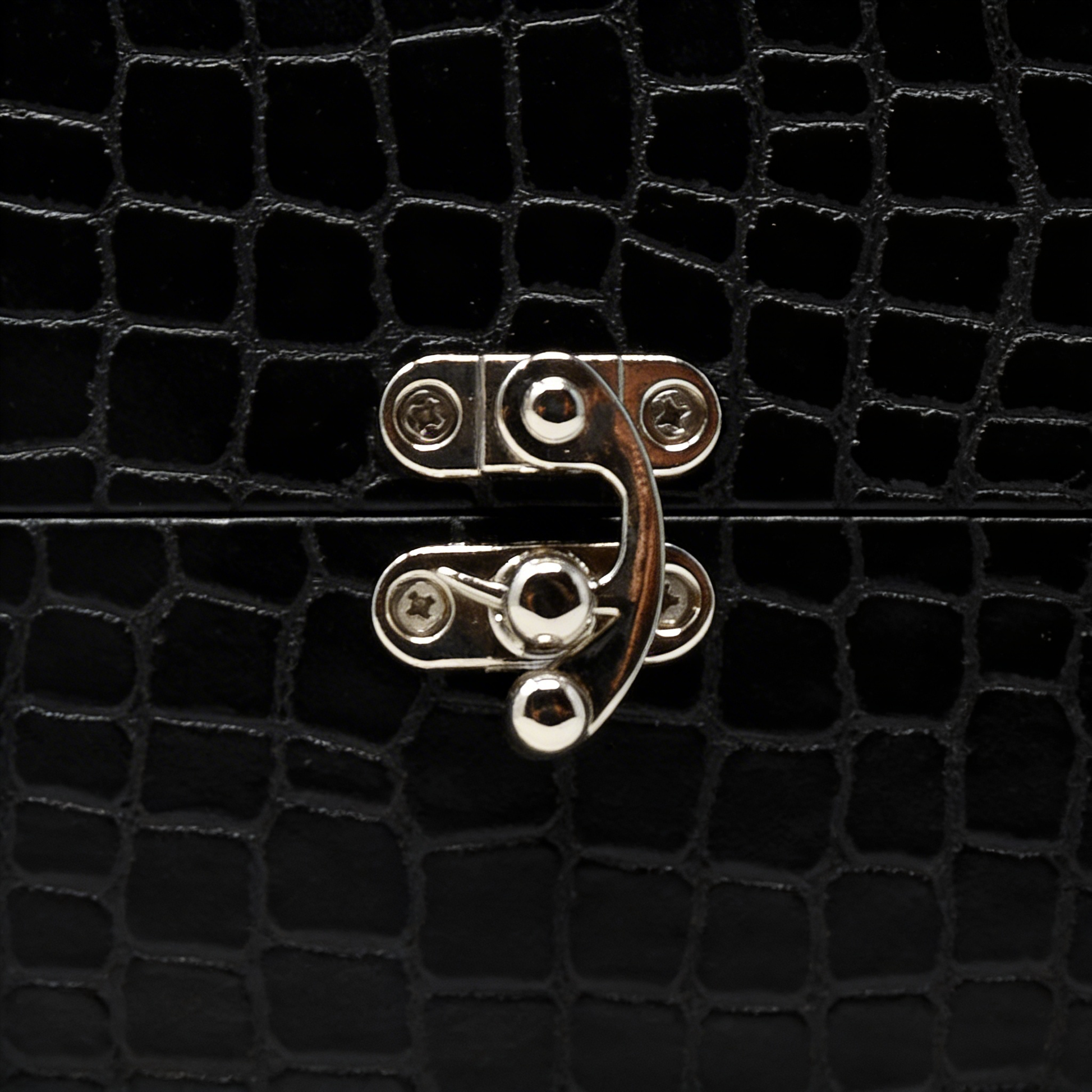 الصندوق: صندوق من الجلد الأصلي بملمس جلد التمساح باللون الأسود الكلاسيكي مع بطانة داخلية من الساتان ومشبك آمن باللون الفضي
