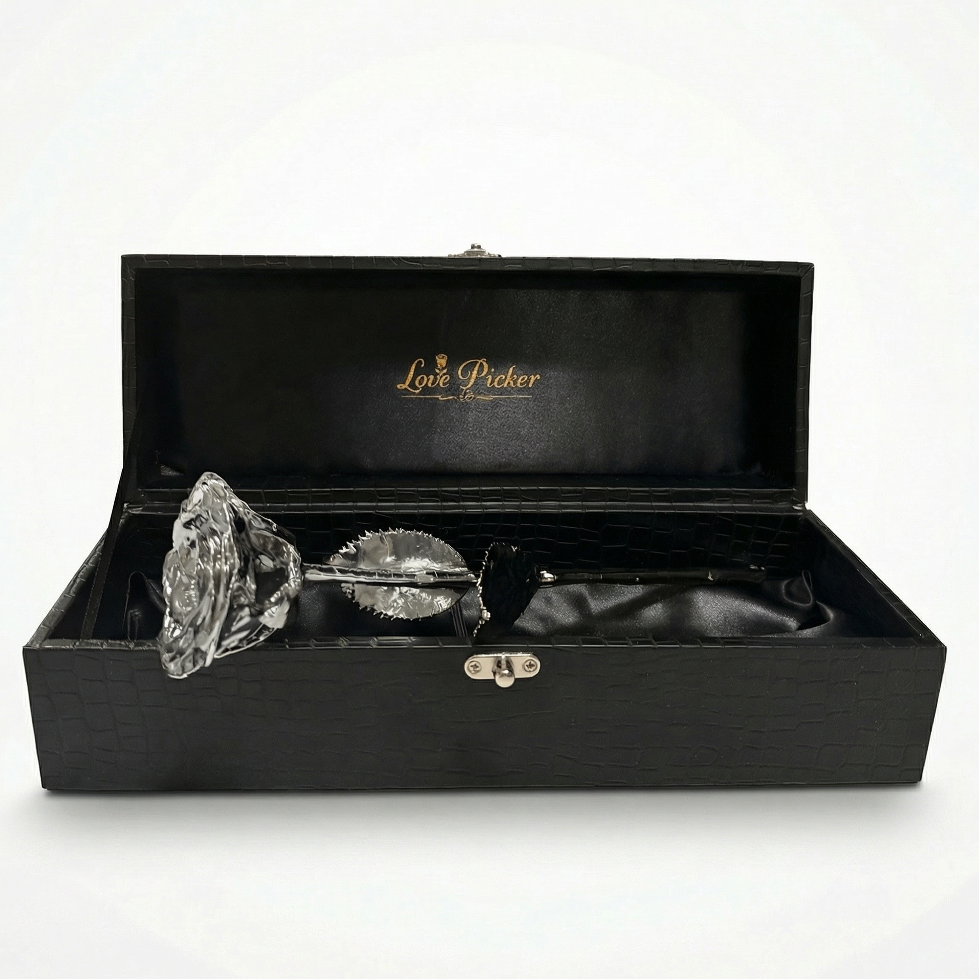 هديةٌ آسرةٌ وخالدةٌ، مُصممةٌ بوردةٍ حقيقيةٍ مطليةٍ بالفضة الخالصة، مُقدمةٌ بعنايةٍ فائقةٍ في علبةٍ جلديةٍ سوداءَ فاخرةٍ بنقشةِ جلد التمساح، ومبطنةٍ من الداخلِ ببطانةٍ ساتانٍ أنيقة. مزودةٌ بلوحةٍ فضيةٍ محفورةٍ لإضفاءِ لمسةٍ شخصيةٍ مميزة، تُعدّ هذه الهديةُ الأنيقةُ مثاليةً للاحتفالاتِ السنويةِ أو المناسباتِ المهمةِ أو الحبِّ الدائم.